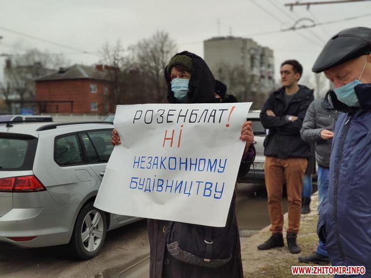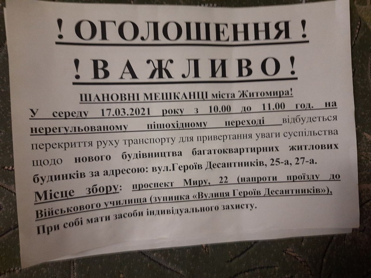 У Житомирі 17 березня зо три десятки людей зібралися на акцію протесту, аби висловити невдоволення будівництвом багатоквартирних будинків на вулиці Героїв Десантників. Протестувальники перекривали дорогу на проспекті Миру (біля зупинки «вулиця Героїв Десантників»).