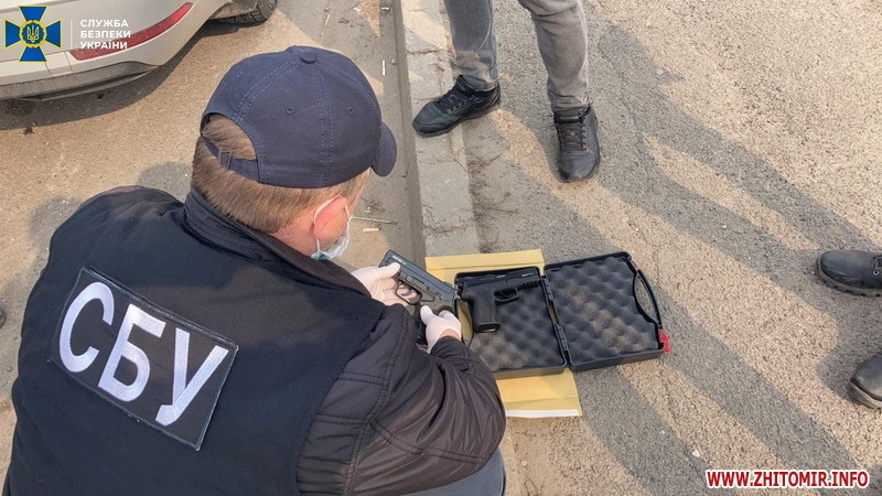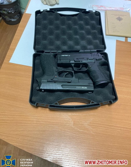 За інформацією пресслужби СБУ в Житомирській області, затриманий житомирянин мав підпільну майстерню з виготовлення бойових засобів ураження. Чоловіка затримали під час збуту двох перероблених під бойові стартових пістолетів.