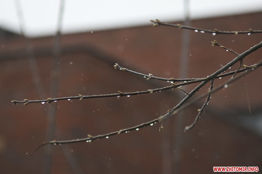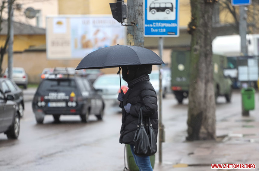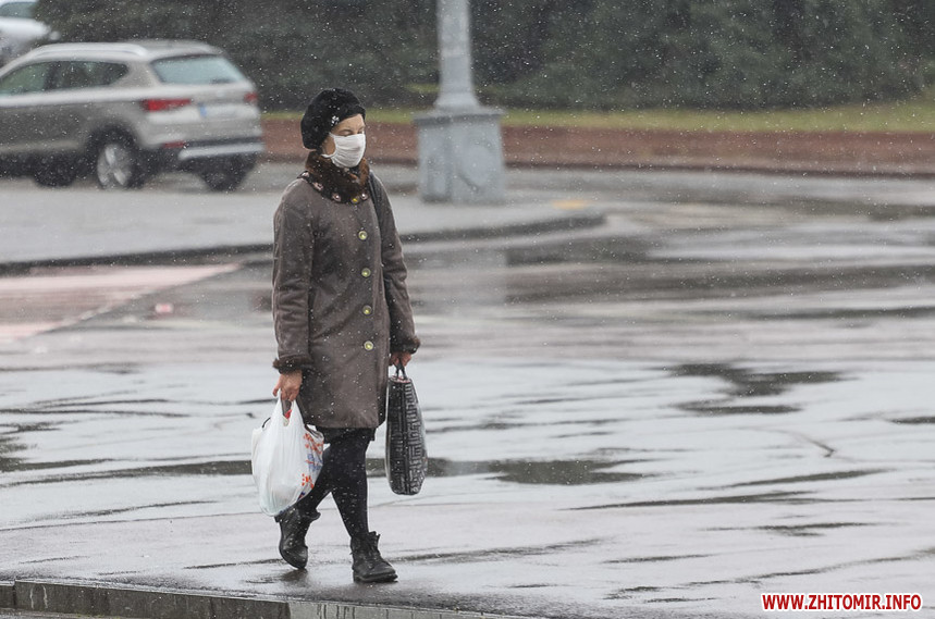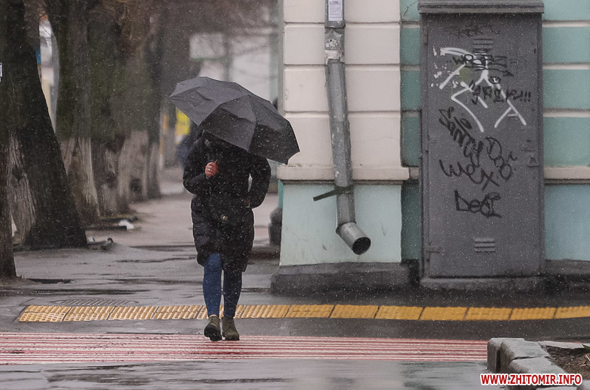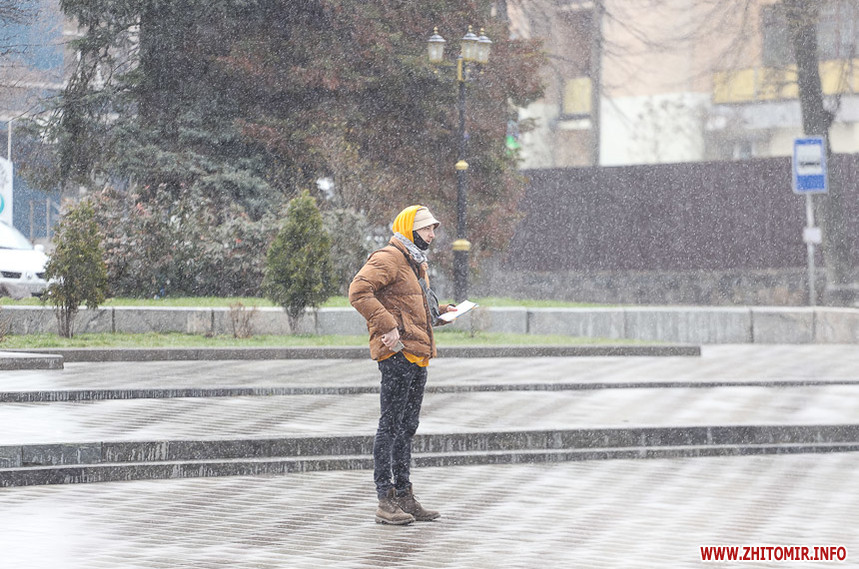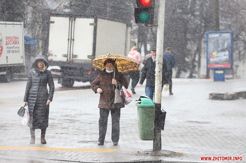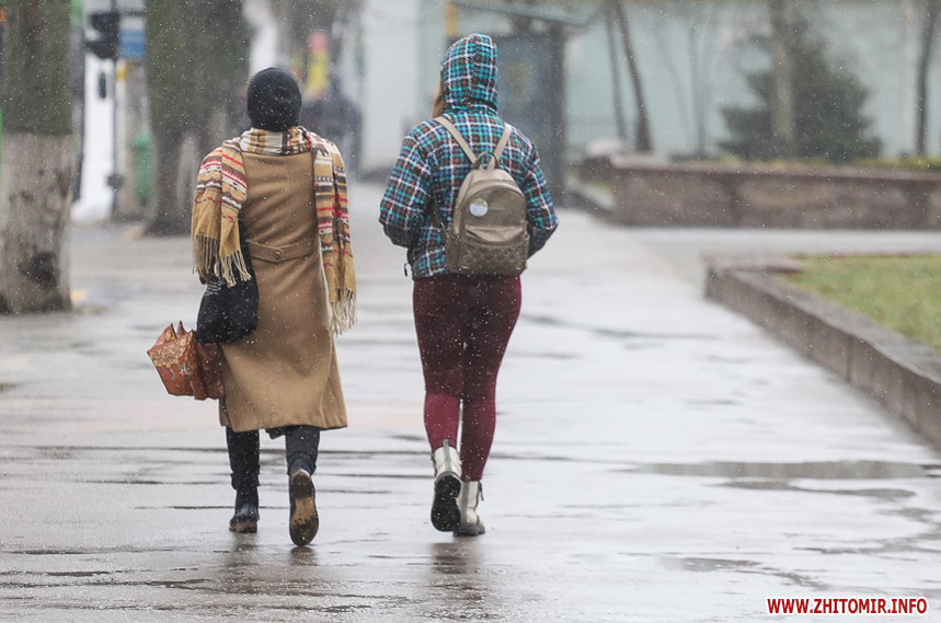 Вдень 7 квітня житомиряни знову дістали з шаф теплі речі - більшість людей на вулицях у зимових пуховиках чи куртках. Майже всі житомиряни - у головних уборах чи капюшонах, багато хто одягнув рукавички та ховається під парасолькою.