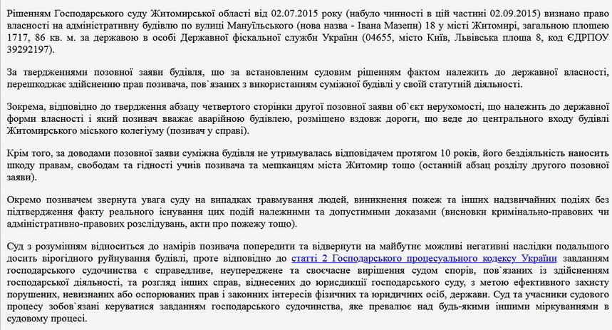 «Старе приміщення колегіуму продовжує руйнуватись та створює небезпеку, в першу чергу для школярів. Власник будівлі ігнорує свій обов’язок щодо належного утримання об’єкта. Неодноразові звернення колегіуму та міськради результату не дали. Тож ми вирішили звернутись до суду. Розгляд справи про знесення будівлі має відбутись вже восени», - написав мер Житомира.