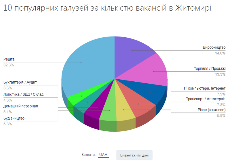 У Житомирі найбільш затребувані фахівці галузі «Виробництво». За статистикою вказаного ресурсу, кількість вакансій у цій галузі становить 14,6% від загальної кількості пропозицій у Житомирі.