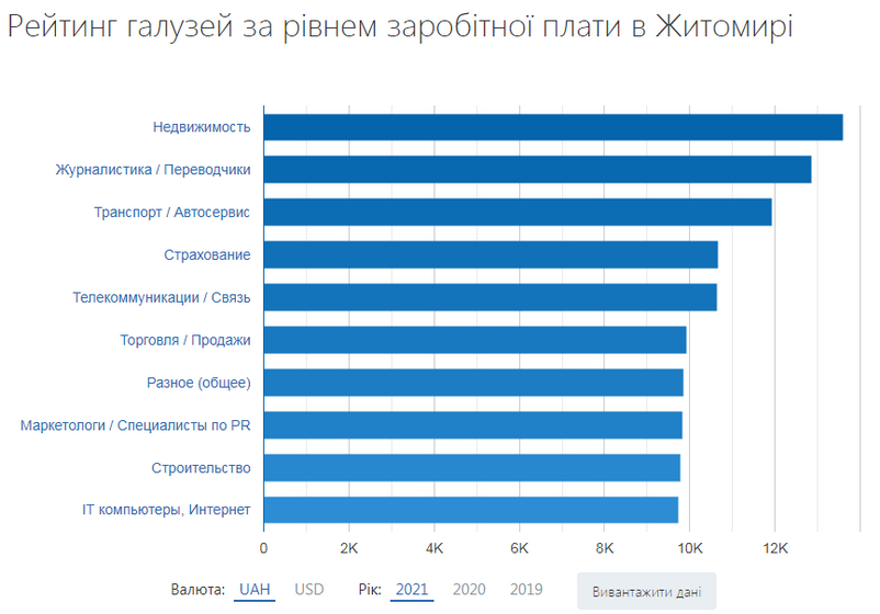 Найбільш високооплачуваною галуззю в Житомирі є «Нерухомість». Середня заробітна плата в галузі становить 13606 грн.