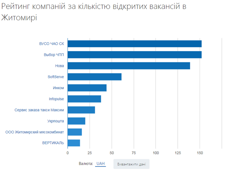 Найбільшим роботодавцем в Житомирі за кількістю пропозицій є ВУСО ЧАО СК. За статистикою сайту, в компанії ВУСО ЧАО СК відкрито 152 вакансії.