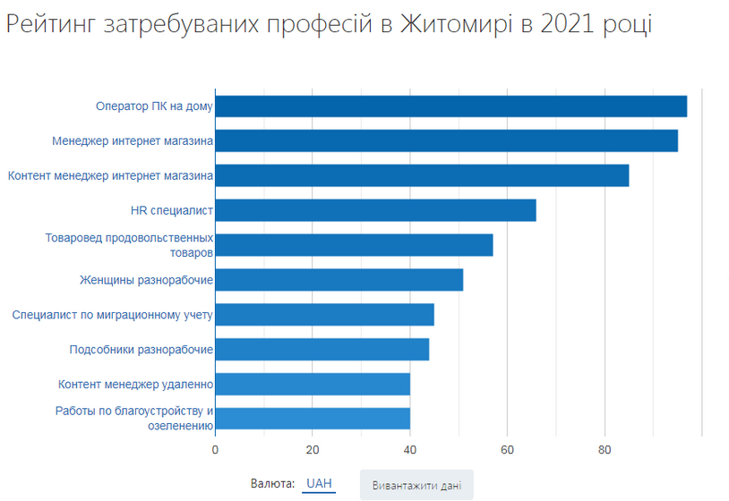 «Оператор ПК на дому» є найбільш затребуваною професією в Житомирі. За даними вище вказаного ресурсу, кількість вакансій становить 97. Рівень середньої заробітної плати у професії «Оператор ПК на дому» дорівнює 9781 грн.