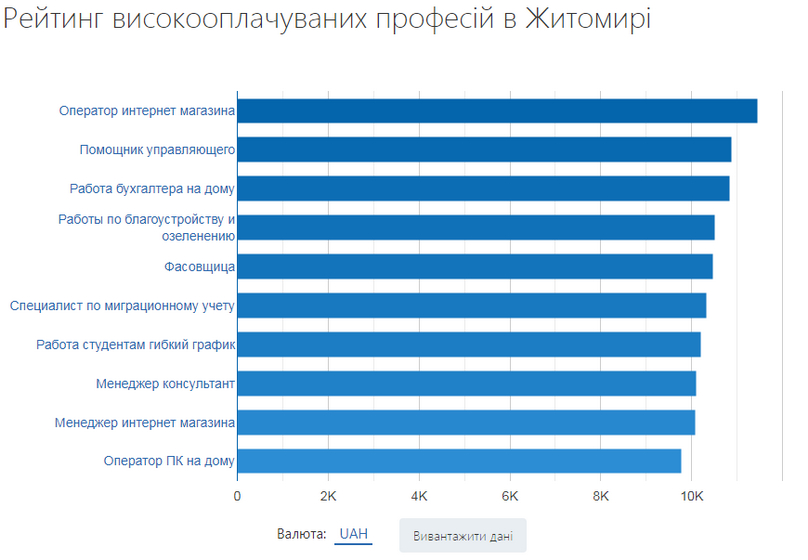 Найбільш високооплачуваною професією в Житомирі є «Оператор інтернет-магазину». За даними сайту оголошень з пропозицій/пошуку роботу, рівень середньої зарплатні становить 11444 грн. На другому місці – «Помічник управляючого» з зарплатнею 10867 грн, а на третьому – «Робота бухгалтера на дому» з заробітною платою 10831 грн.