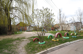 У дворах тут досить багато дитячих гойдалок, прикрас та майданчиків “хендмейд”, зроблених з автомобільних шин. У деяких дворах шинами не лише прикрашають територію майданчика, але й облаштували з них імпровізовану фотозону.