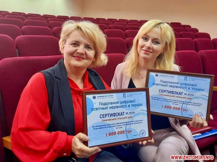 Громади Житомирської області отримали сертифікати від Асоціації міст України на обладнання шкільних кабінетів сучасним програмним забезпеченням у рамках проєкту «Подолання цифрової освітньої нерівності» на загальну суму 12,3 млн.грн. Вручення відбулося під час форуму «Децентралізаційна реформа: фундамент є, будуємо стіни!», організованого Житомирським РВ АМУ 22 травня 2021 року.