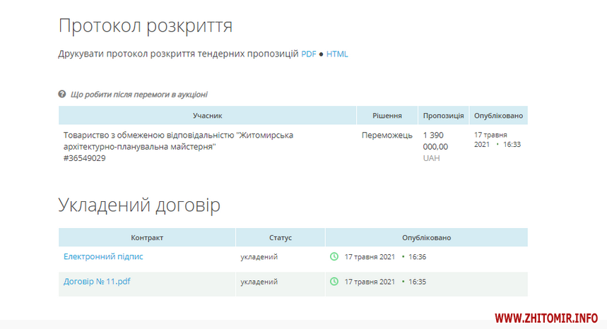 За результатами проведеної спрощеної закупівлі, 14 травня УКБ уклало договір з ТОВ «Житомирська архітектурно-планувальна майстерня». Підрядник має провести коригування попереднього проєкту будівництва індустріального парку на Київському шосе в Житомирі. Терміни виконання робіт – 120 календарних днів, тобто до 14 вересня 2021 року.