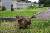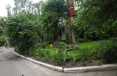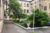 Поліклініка на Польовому майдані, 2 розділена на два крила – для дітей та для дорослих. Територія за будівлею огороджена парканом і ворота закриті, проте зовнішній дворик виглядає чистим, тут є кілька малих скульптур з дерева, клумби з шин, лавки і автостоянка.