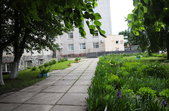 Поліклініка для дорослих на Лесі Українки, яка є підрозділом КП «Лікарні №2 імені В.П,Павлусенка». Тут дуже чисто, хоча і старе асфальтне покриття, у дворі квітують іриси, є запарковані автомобілі та мотоцикл. Територія огороджена парканом, але ворота відкриті.