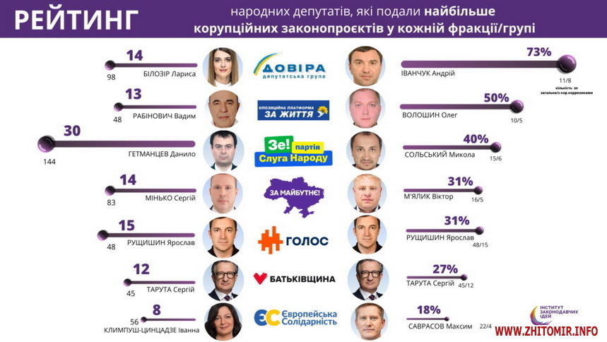 В оприлюдненому рейтингу всіх народних депутатів є інформація про нардепів-мажоритарників від Житомирської області та керівників обласних організацій партії «Слуга народу» та ВО «Батьківщина».