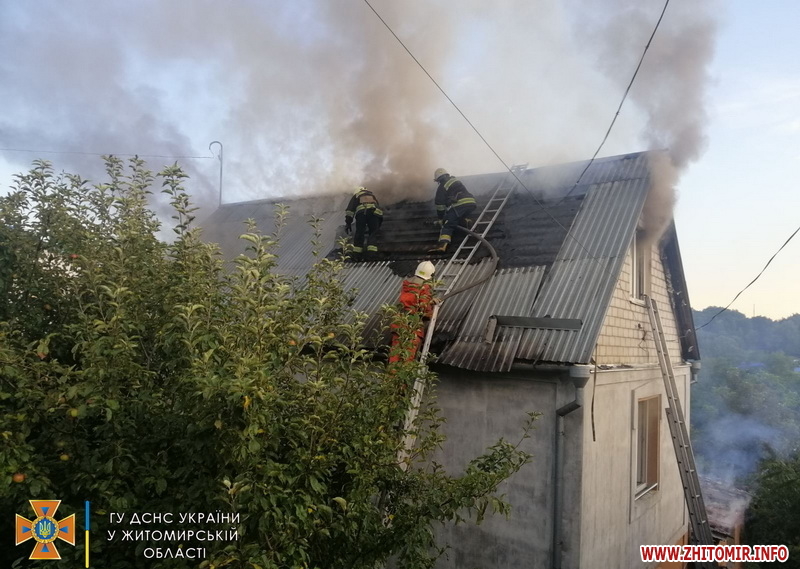 «15 серпня о 18:54 до Служби порятунку «101» надійшло повідомлення про пожежу в приватному цегляному житловому будинку в м. Житомир. На місці події бійці ДСНС встановили, що осередок загоряння знаходиться на даху одноповерхової оселі, до якої впритул прибудований двоповерховий будинок. Вогонь встиг розповсюдитися і частково охопив покрівлю останнього. Існувала загроза потрапляння полум’я всередину житлових приміщень обох будівель. Зважаючи на всі фактори ризику, керівник гасіння залучив на допомогу ще один пожежний автомобіль для підвозу води», - повідомили рятувальники.