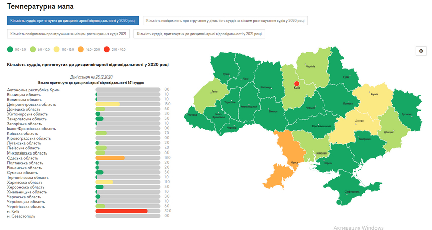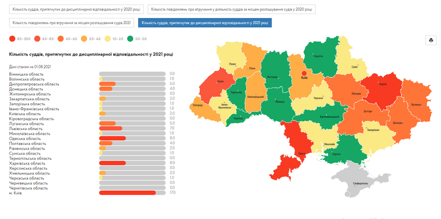 Так, у 2021 році у Житомирській області немає суддів, притягнутих до дисциплінарної відповідальності. Найбільше суддів, яких 2021 уже притягнули до дисциплінарної відповідальності, у місті Київ – 17, в Одеській і Харківській областях – по 8, у Львівській області – 7.