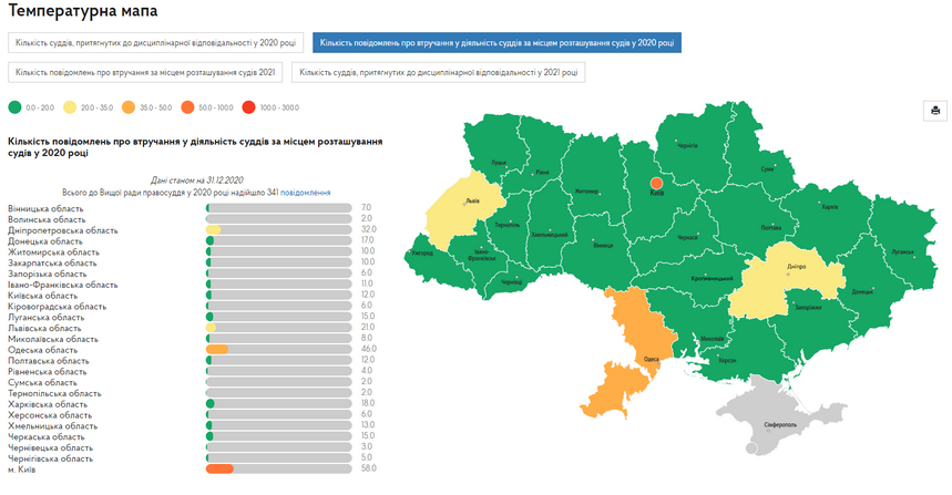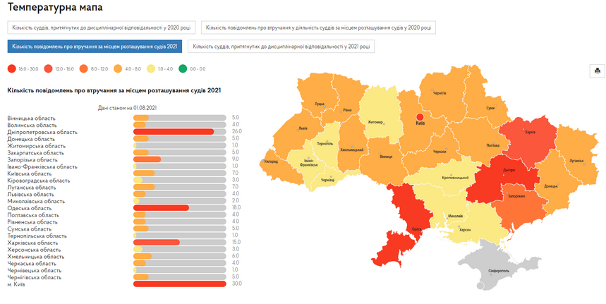 Вища рада правосуддя оприлюднила температурну мапу, яка містить інформацію про кількість суддів, притягнутих до дисциплінарної відповідальності у різних областях, кількість повідомлень про втручання за місцем розташування судів.