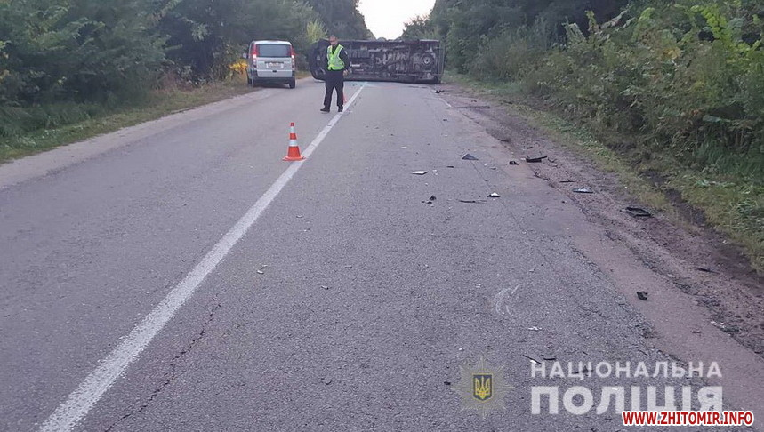 Поліція встановлює обставини ДТП, що сталася уночі вранці 20 серпня поблизу села Маркушів Бердичівського району: від зіткнення з вантажним бусом перекинувся пасажирський автобус. Постраждали дитина і чоловік.