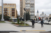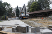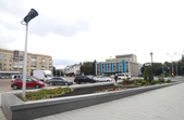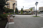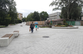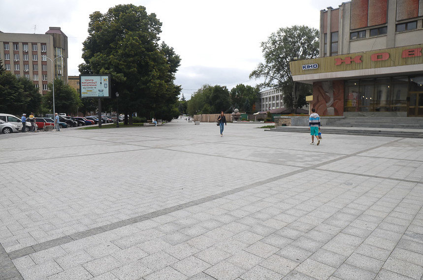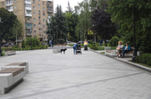 Очевидно, роботи у сквері завершені: нині там вкладена плитка, встановлені урни, лавки, облаштоване освітлення, а на флагштоці майорить державний прапор.