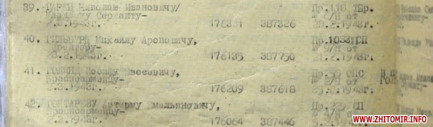«Під час проведення пошукових робіт на місцях жорстоких боїв початкового етапу Курської битви (Росія), пошуківцями із загону "Застава св. Ільї Муромця" були знайдені рештки солдата з медаллю "За бойові заслуги" №176135. По номеру медалі встановили ім'я воїна. Ним виявився уродженець м. Житомир, єфрейтор-телефоніст: Гільбурд (т) Михайло Аронович, 1915 р.н. Батько: Гильбурд (т) Арон Хунович, проживав за адресою вул. Воздвиженська №3 (нині Шолом Алейхема). Пошуки за місцем проживання результатів не дали», - йдеться у повідомленні.