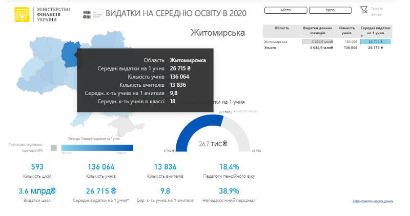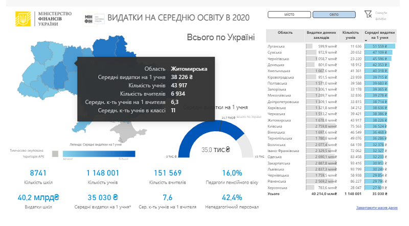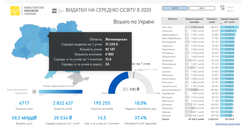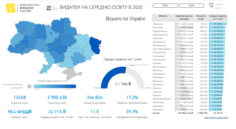 «Міністерство фінансів підготувало оновлений інтерактивний аналітичний інструмент («дашборд») про бюджетні видатки на загальну середню освіту у 2020 році. В аналізі використана інформація виключно по денних закладах загальної середньої освіти (ЗЗСО) комунальної форми власності», – зазначають у Мінфіні.