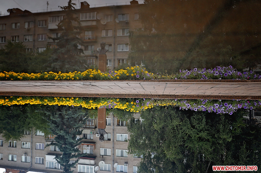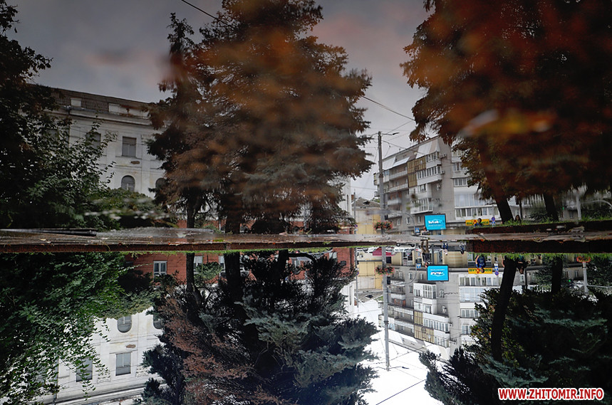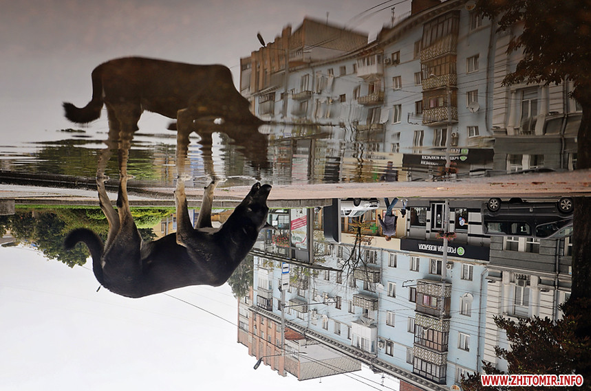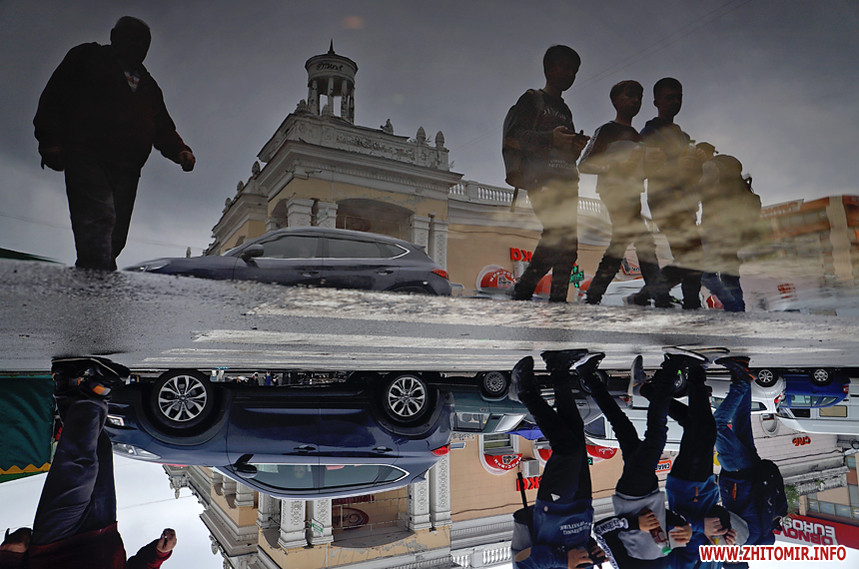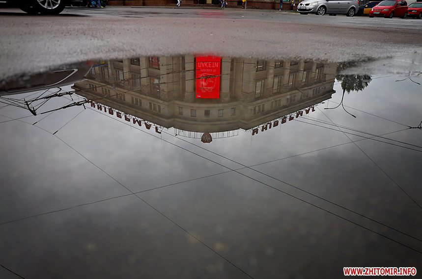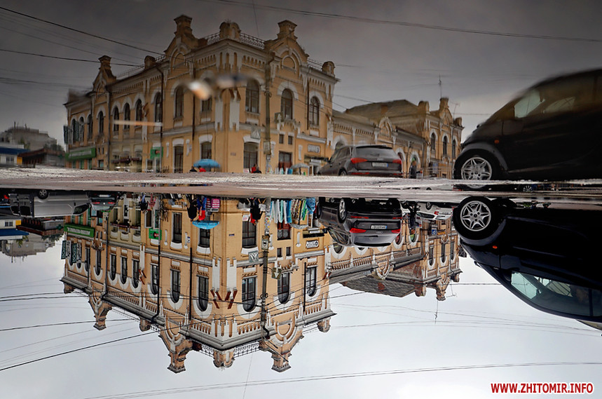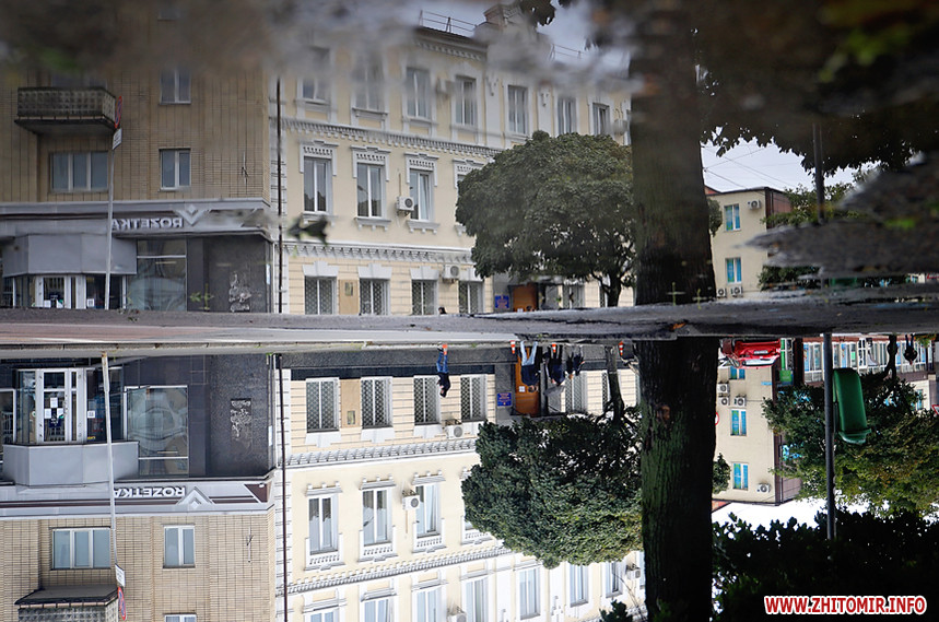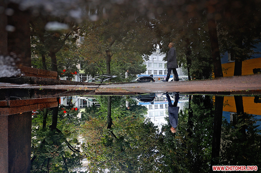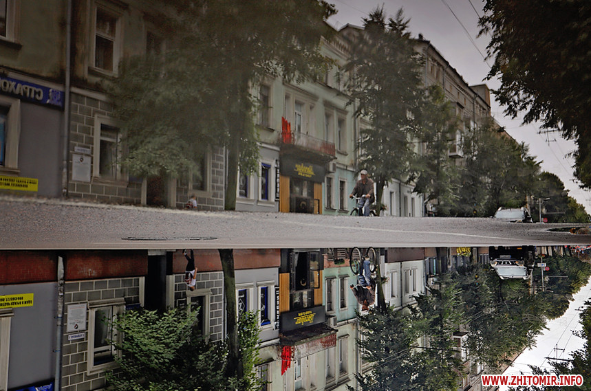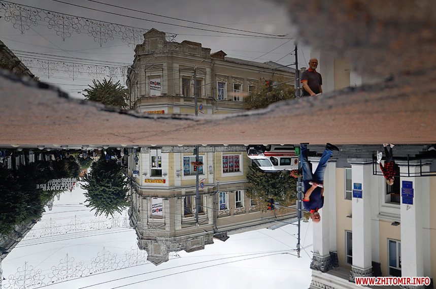 Заповнені дощовою водою ями на тротуарах та дорогах створюють справжні картини, у яких відбивається Житомир. Відображення перевернутого світу у калюжах схожі на інший вимір. Вони зачаровують і дають змогу створювати цікаві світлини як на фотоапарат, так і на мобільний телефон.