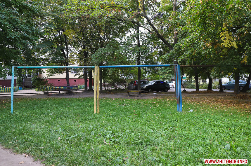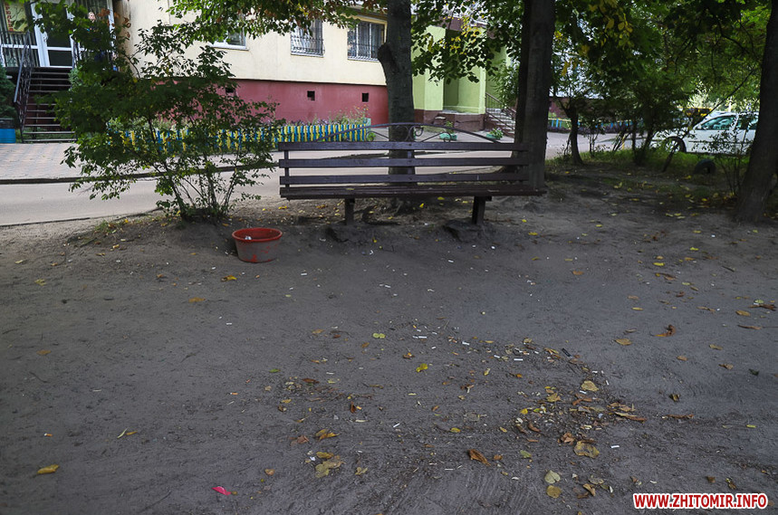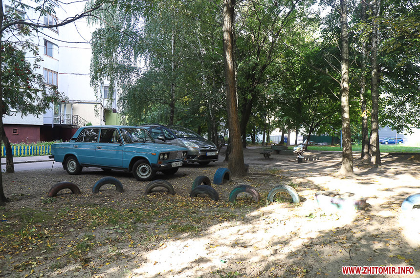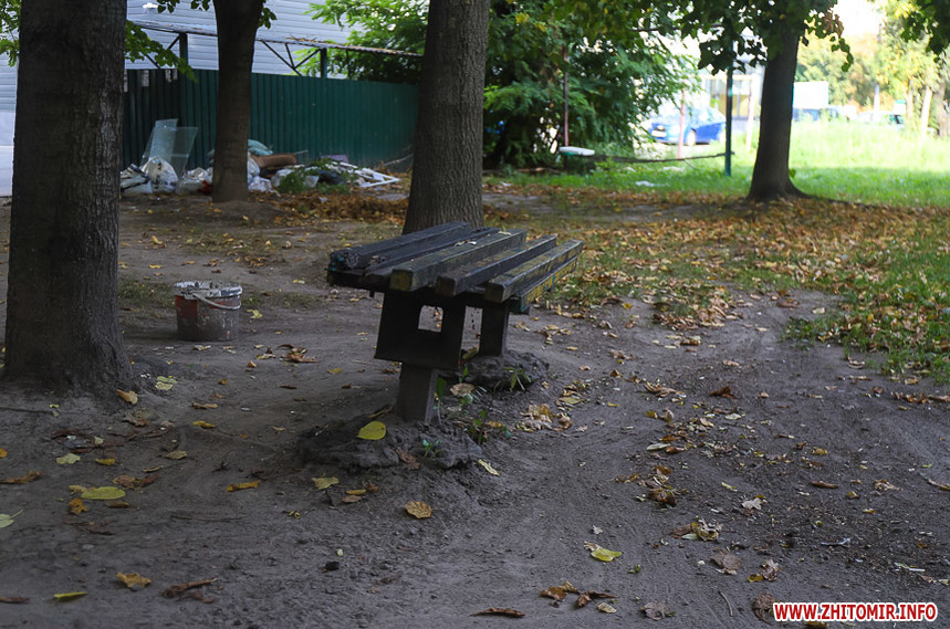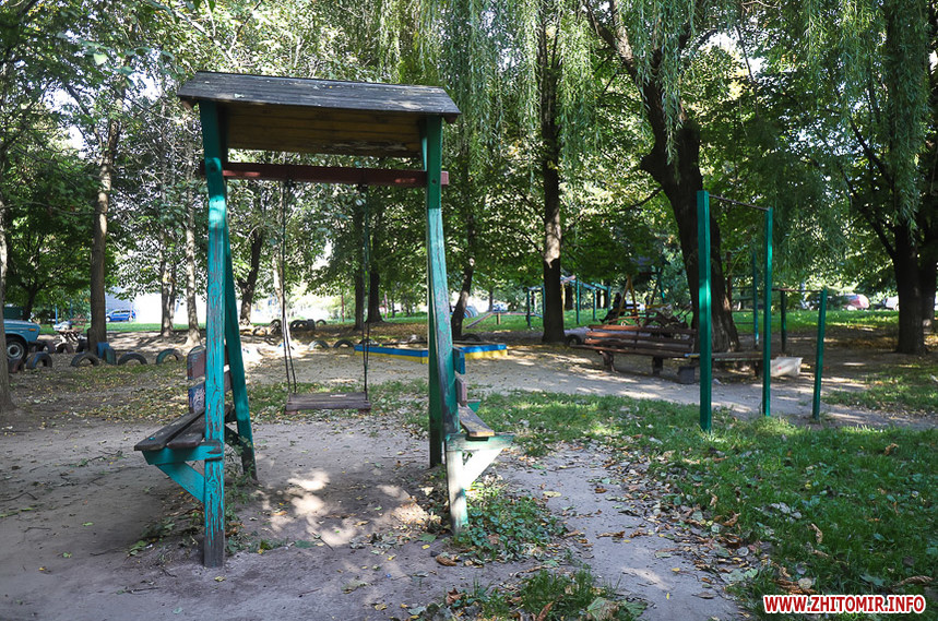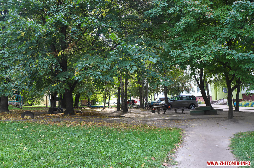 З великою кількістю лавок, облаштованими самостійно стоянками, старими дитячими майданчиками і турніками – такий вигляд має територія біля будинку по проспекту Миру, 9, де за 3,2 млн грн планують облаштувати сквер.