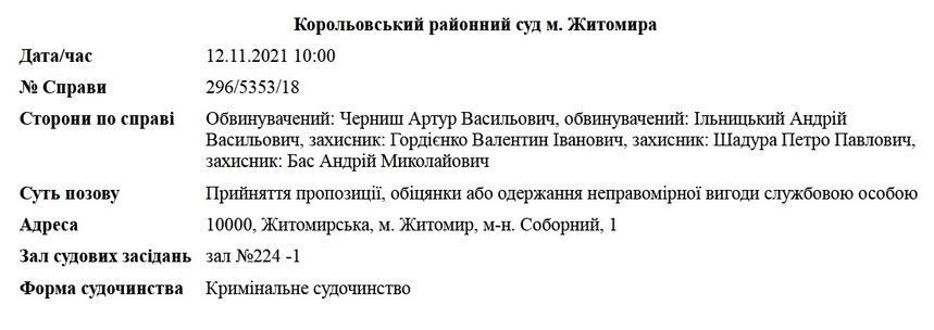 Як повідомляв Житомир.info, в червні 2018 року слідчим відділом прокуратури Житомирської області було завершене досудове розслідування у кримінальному провадженні за фактом вимагання та одержання директором держпідприємства «Житомирський експертно-технічний центр Держпраці» та його пособником неправомірної вигоди. Посадовця затримали 2 березня 2018 року: директор Житомирського ЕТЦ вимагав від приватного підприємця неправомірну вигоду на суму 140 тис. грн, пообіцявши йому безперешкодно затвердити та надати висновки експертиз, необхідних для функціонування газової автозаправної станції, що в м. Новоград-Волинський. На сайті Житомирського ЕТЦ зазначається, що директором цього державного підприємства є Черниш Артур Васильович. Чергове засідання у справі про хабар призначене на 12 листопада 2021 року.