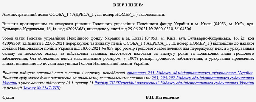 Суд визнав дії Пенсійного фонду протиправними і зобов’язав здійснити з 22.06.2021 перерахунок та виплату пенсії відповідно до довідки Нацполіції.