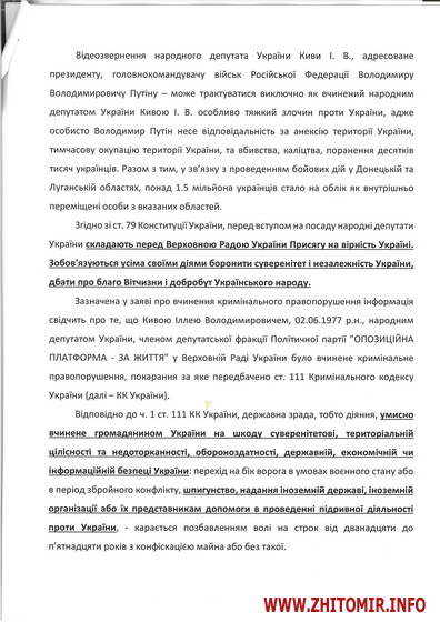 "За 7 років бойових дій на сході України загальна кількість людських втрат становила 42 500 – 44 500 осіб. Понад 1,5 мільйона українців стали на облік як внутрішньо переміщені особи. Відповідальність за це, а також за анексію та тимчасову окупацію територій України несе особисто Володимир Путін - головнокомандувач військ Російської Федерації. Тому відео, опубліковане на офіційному Телеграм-каналі народного депутата Іллі Киви, в якому він на фоні державних прапорів України вітає Путіна з днем народження, може трактуватися виключно як державна зрада", - йдеться в заяві.