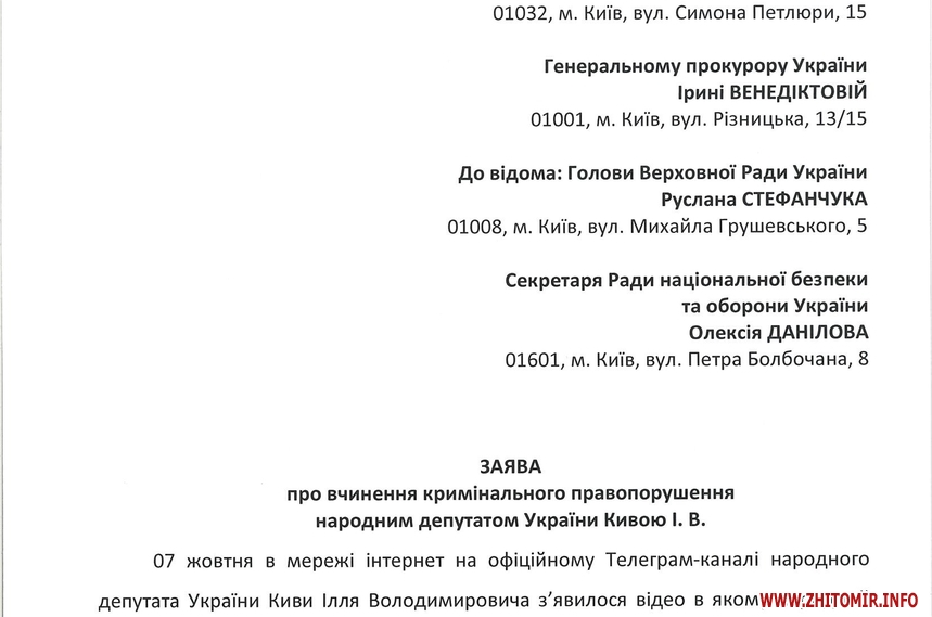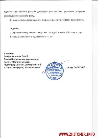 Партія «УДАР Віталія Кличка» просить правоохоронні органи розпочати досудове розслідування щодо вчинення Іллєю Кивою кримінального правопорушення, покарання за яке передбачено ст. 111 КК України - "Державна зрада". Внести відповідні відомості до Єдиного реєстру досудових розслідувань та надати витяг з реєстру, а також розпочати досудове розслідування вказаного факту.