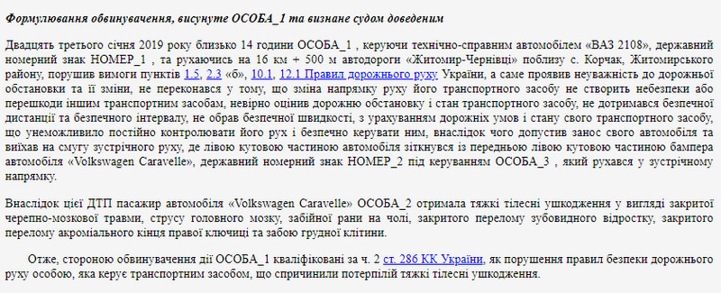 У матеріалах суду зазначається, що близько 14.00 23 січня 2019 водій автомобіля ВАЗ 2108 поблизу села Корчак проявив неуважність до дорожньої обстановки, не дотримався безпечної дистанції та інтервалу і допустив занос автомобіля, виїхав на зустрічну смугу, де зіткнувся з автомобілем Volkswagen Caravelle, який рухався в зустрічному напрямку. В результаті аварії пасажирка мікроавтобусу отримала тяжкі тілесні ушкодження – струс мозку, забій чола, закриті переломи і забій грудної клітини.