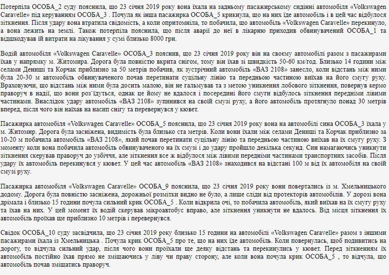 Потерпіла в суді розповіла, що була пасажиркою мікроавтобусу, їхала на задньому сидінні. Жінка лише чула крики інших пасажирів про те, що на них їде інший автомобіль, а після зіткнення втратила свідомість. Потерпіла повідомила, що обвинувачений приходив до неї у лікарню і відшкодував витрати на лікування у сумі 8 тис. грн.