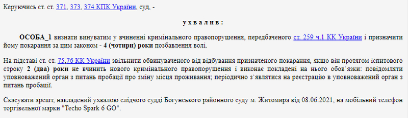 «Як з’ясувалось, затриманий раніше вже вчиняв подібні протиправні дії: улітку 2019 року він повідомив, що відбудеться вибух у Любарському районному суді. Тоді чоловікові було призначено покарання, не пов’язане з позбавленням волі», - повідомляли в червні 2021 правоохоронці.