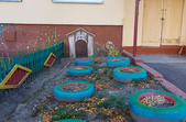 Так, на Домбровського, 86 можна побачити пальми, пса-охоронця на стіні, криницю з крокодилом, лебедів та троянду з шин, багато іграшок та креативних малюнків на стінах.
