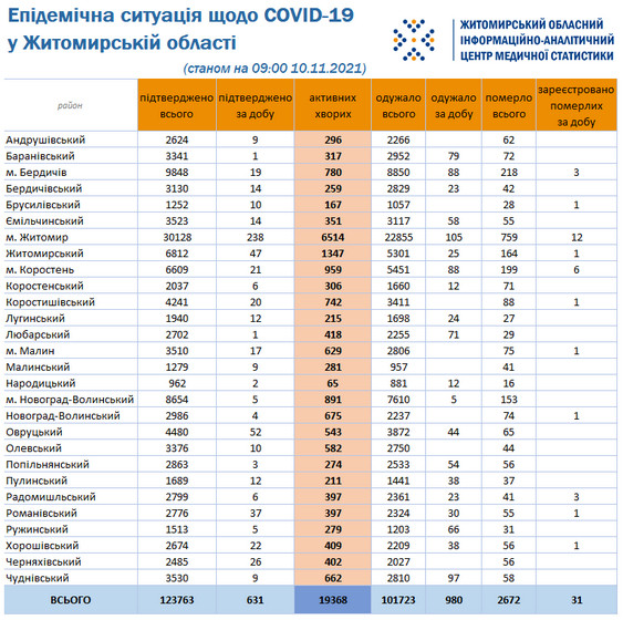 Станом на ранок 10 листопада 2021 року в Житомирській області лабораторно підтверджено 123763 випадки коронавірусної хвороби, з них 631 виявили упродовж минулої доби, 9 листопада. Загалом від ускладнень СOVID-19 в області померли 2672 людини, упродовж минулої доби зафіксували 31 летальний випадок.