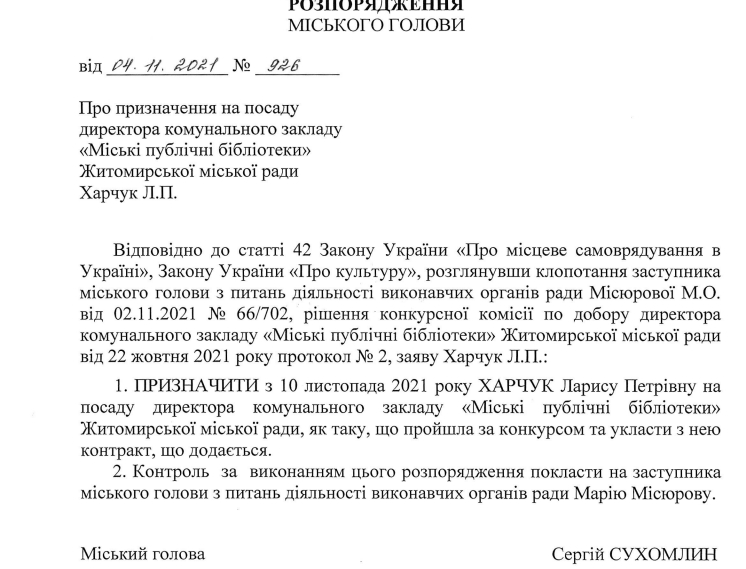 «Призначити з 10 листопада 2021 року Харчук Ларису Петрівну на посаду директора комунального закладу «Міські публічні бібліотеки» Житомирської міської ради, як таку, що пройшла за конкурсом та укласти з нею контракт, що додається», - йдеться в документі.