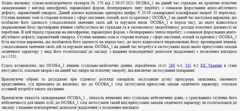 Таким чином суд встановив, що чоловік вчинив суспільно-небезпечні діяння в стані неосудності, оскільки хворів і зараз хворіє на психічну хворобу, яка виключає застосування покарання. До 31 грудня 2021 року включно чоловік має перебувати у відповідному закладі.