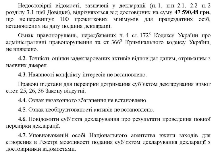 «Недостовірні відомості, зазначені в декларації, відрізняються від достовірних на суму 47590,48 грн, що не перевищує 100 прожиткових мінімумів для працездатних осіб, встановлених на дату подання декларації. Ознак правопорушень, передбачених ч.4 ст. 172-6 Кодексу України про адміністративні правопорушення та ст.366-2 Кримінального кодексу України, не виявлено», - йдеться у висновку НАЗК.
