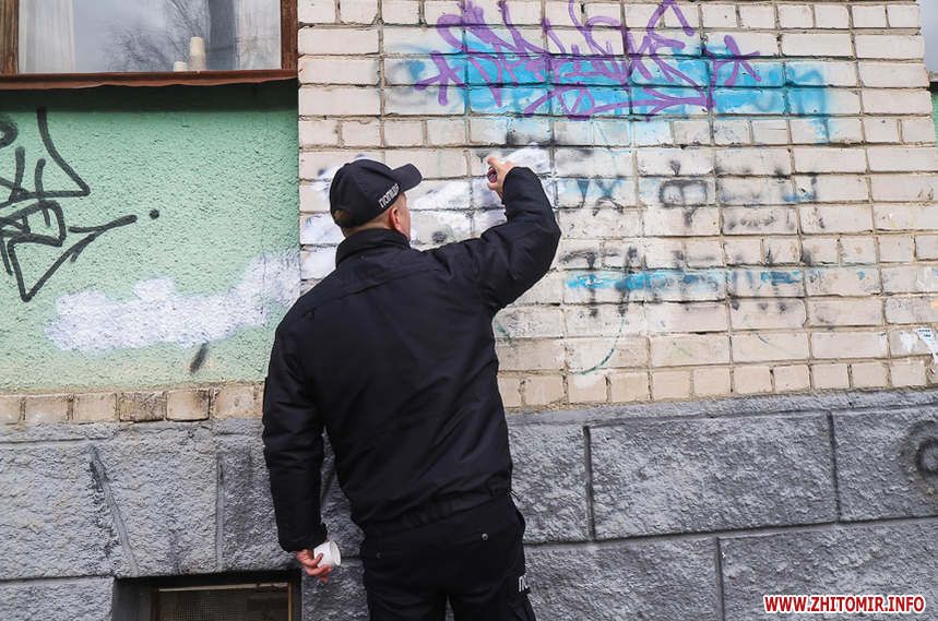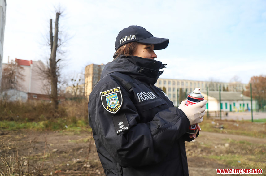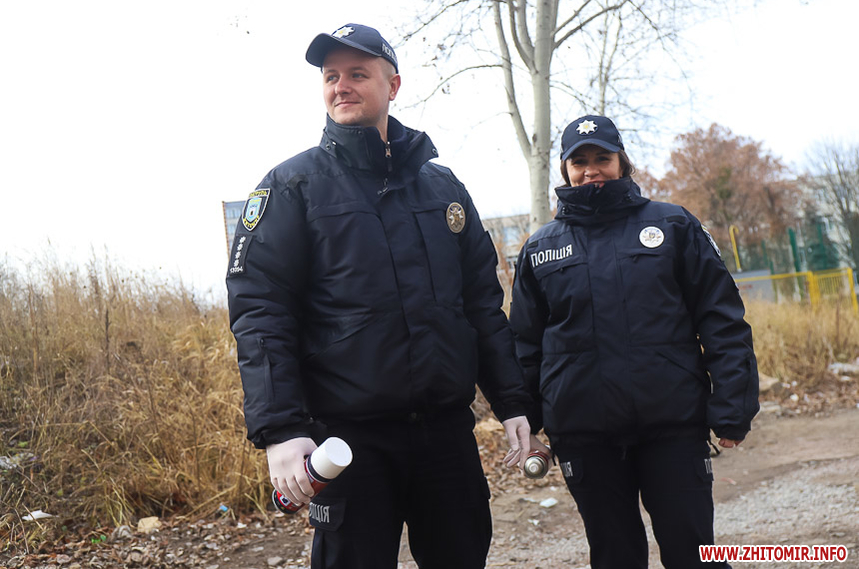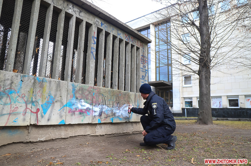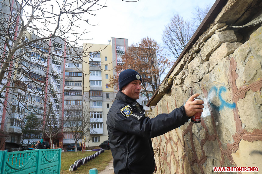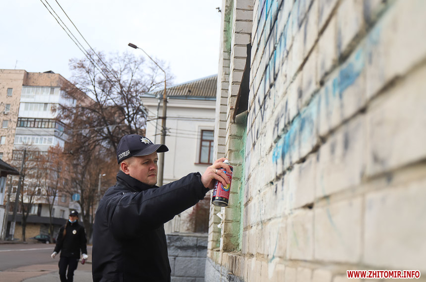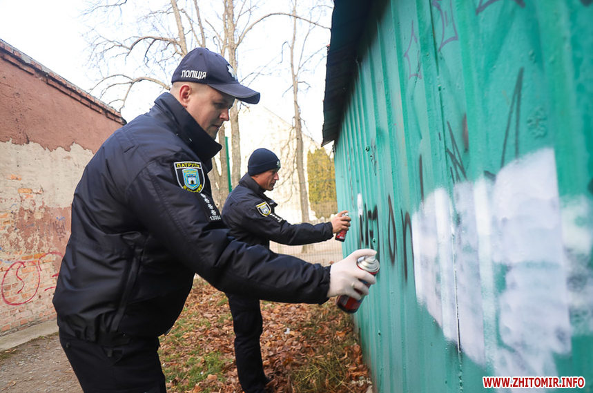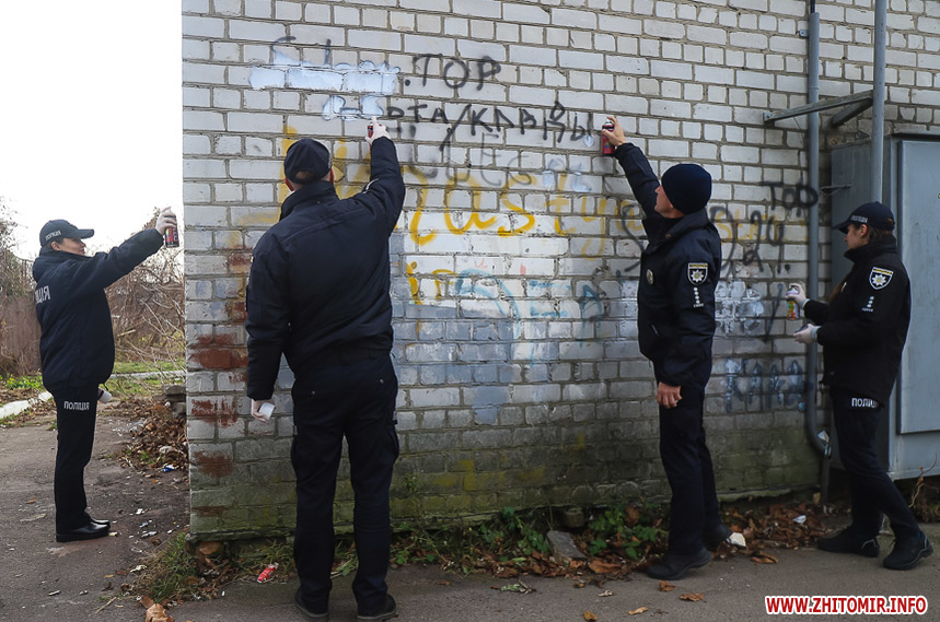 23 листопада поліцейські з сектору зв’язків з громадськістю та пресслужби патрульної поліції Житомирської області, «озброївшись» балончиками з фарбою та гумовими рукавичками, влаштували чергову акцію з зафарбовування біля навчальних закладів у центрі міста. Під час акції до правоохоронців неодноразово підходять місцеві жителі і показують написи.
