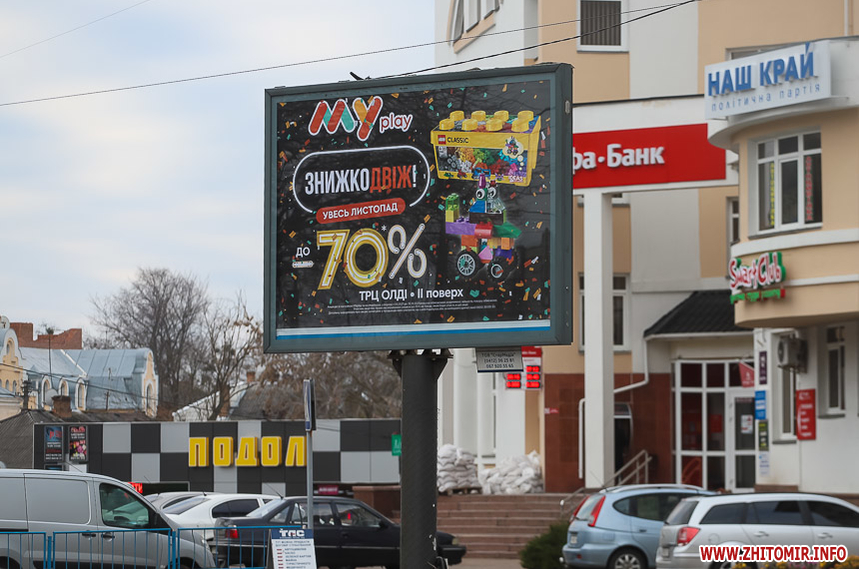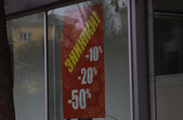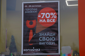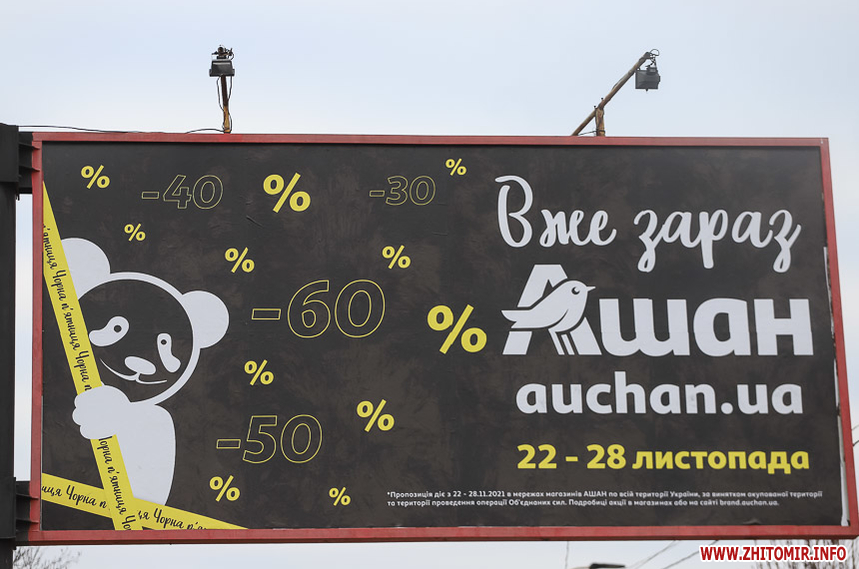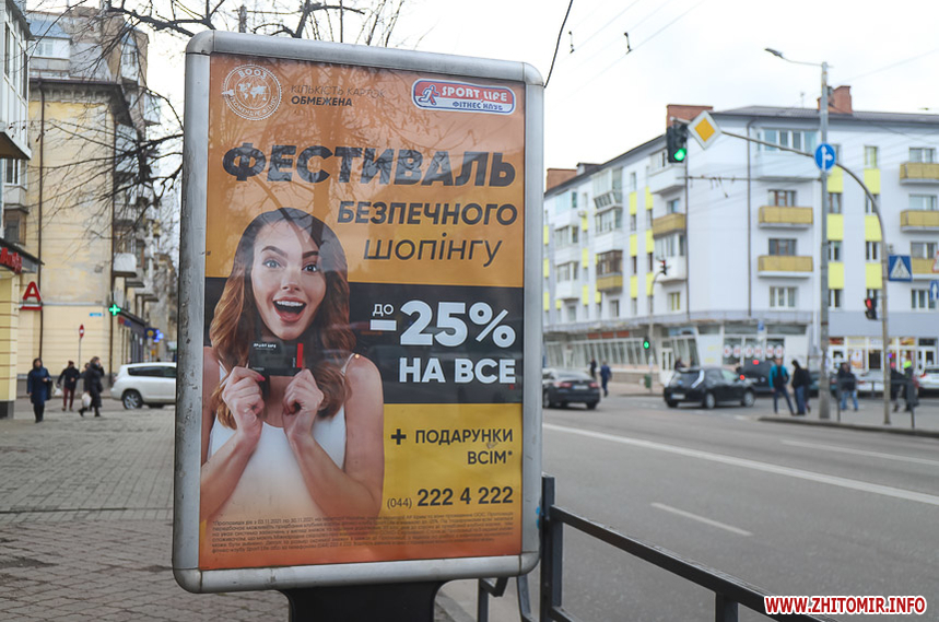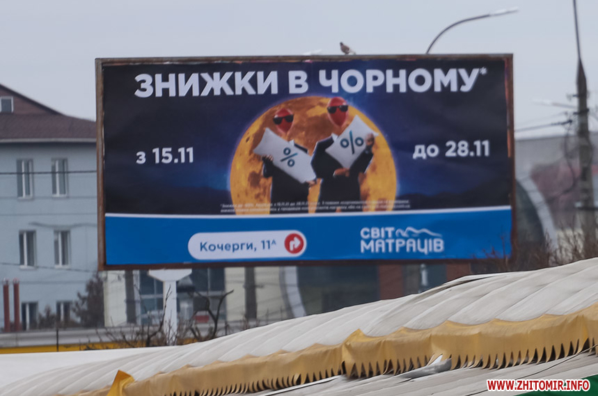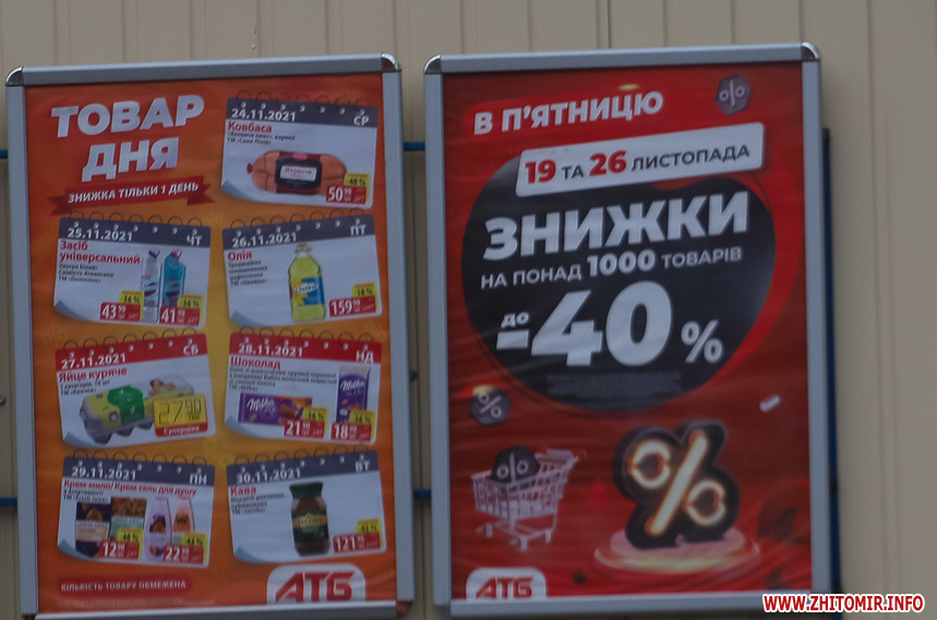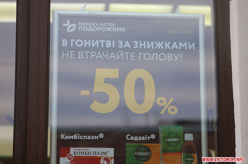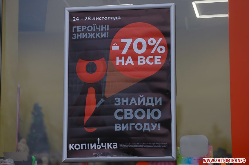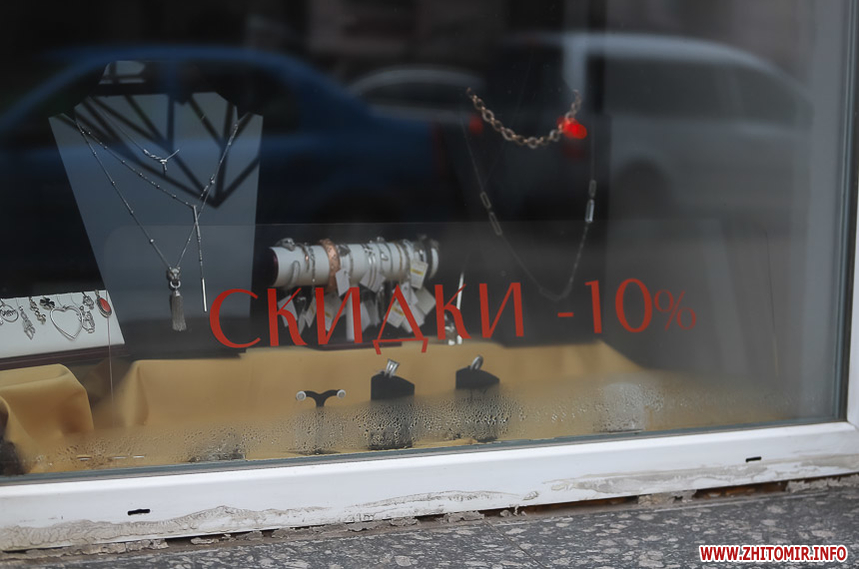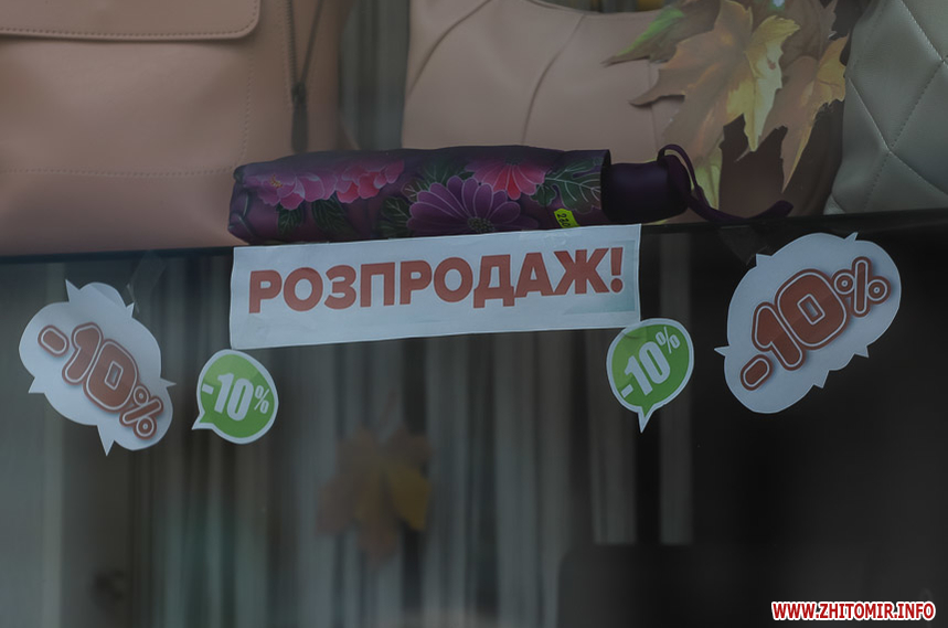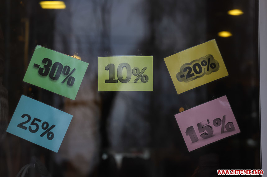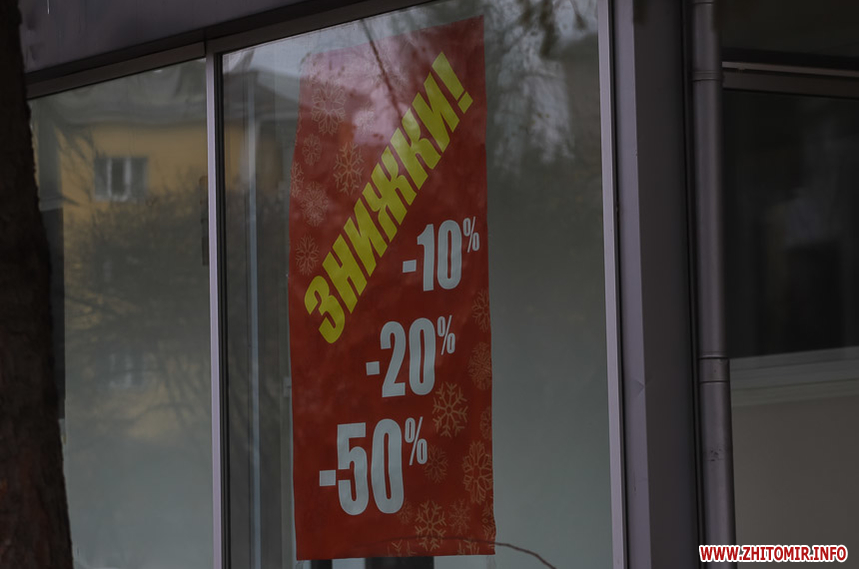 Цьогоріч оголошень, вивісок, банерів, що «говорять» про зниження цін, в Житомирі дуже багато. На кожному кроці, не лише магазини, пекарні, секонд-хенди, але навіть аптеки пропонують шалені знижки. В одній з аптек рекламний плакат закликає «не втрачати голову в гонитві за знижками» і пропонує до -50% на деякі лікарські засоби.