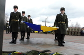 Біля меморіалу був розгорнутий прапор, а оркестр виконав Державний Гімн України.