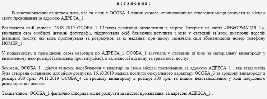 Послуги жінка надавала у власній квартирі. Зокрема, згідно з матеріалами суду, були задокументовані принаймні два факти надання сексуальних послуг (16 жовтня на 4 листопада 2019 року) за грошову винагороду в розмірі 300 гривень. Тож, як вказано в ухвалі, у своєму помешканні житомирянка фактично створила місце розпусти.