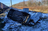 Судячи з фото, у результаті зіткнення з поїздом автомобіль перевернувся.