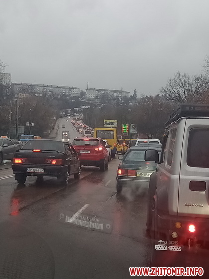 Інший читач повідомив, що поблизу місця автопригоди утворився затор: автомобілі стоять від повороту на Зарічани до перехрестя вулиць Великої Бердичівської та Жуйка.