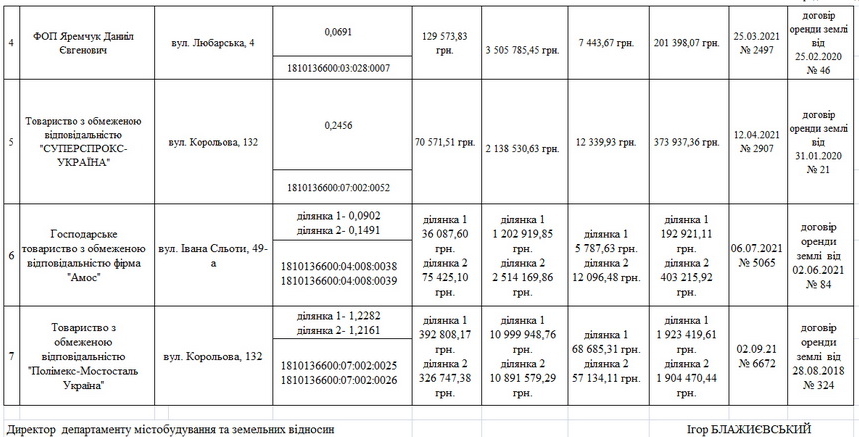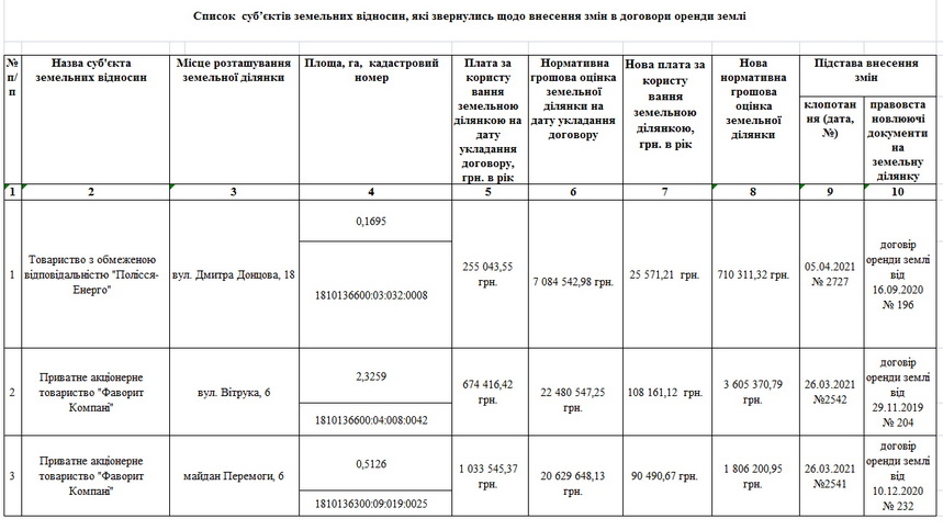 У додатку до проєкту рішення було шість суб’єктів господарювання, які хотіли суттєво зменшити оренду плату за землю у зв’язку з перерахунком нормативної грошової оцінки земельних ділянок. Наприклад, ТОВ «Полісся-Енерго», яке платило за 0,1695 га землі на вул.Дмитра Донцова, 18 орендну плату 255 тис. 043,55 грн на рік просило встановити її в розмірі 25 тис. 571,21 грн; ПрАТ «Фаворит-Компані» за 0,5126 га на майдані Перемоги, 6 хотіло зменшити оренду плату з 1 млн 033 тис. 545,37 грн на рік до 90 тис. 490,67 грн; ТОВ «Суперпрокт-Україна» за 0,2456 га на вул.Корольова, 132 мало сплачувати 70 тис. 571,51 грн, а нова плата становила 12 тис. 339,93 грн.