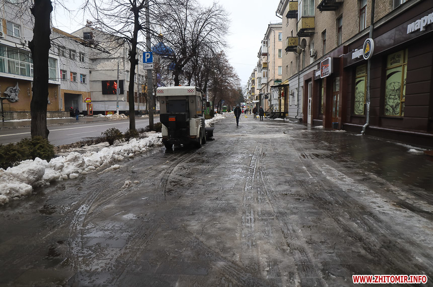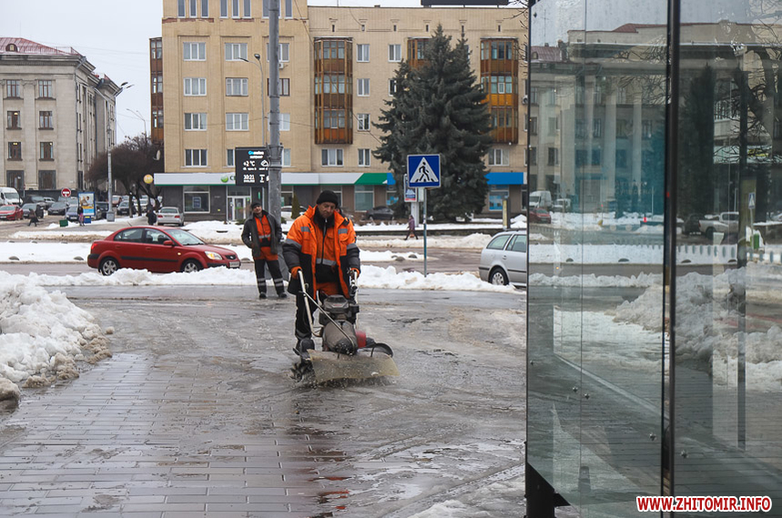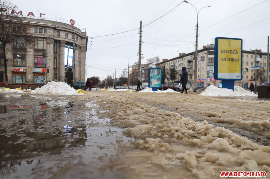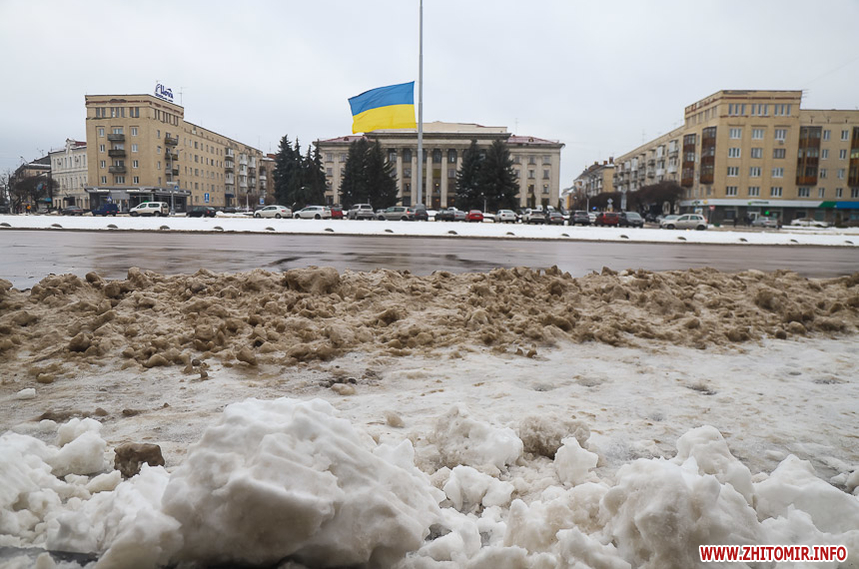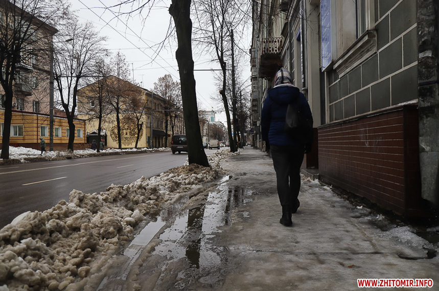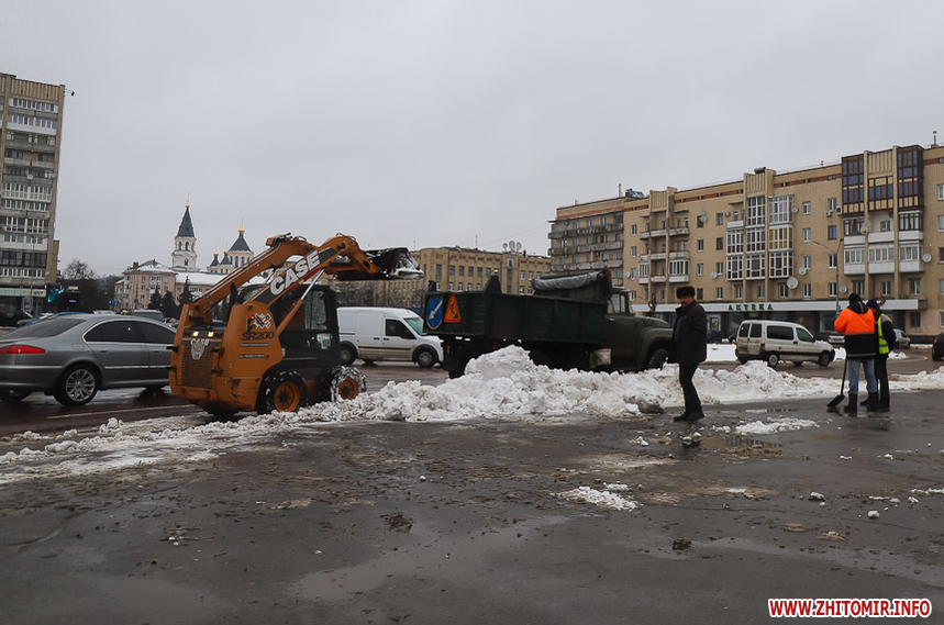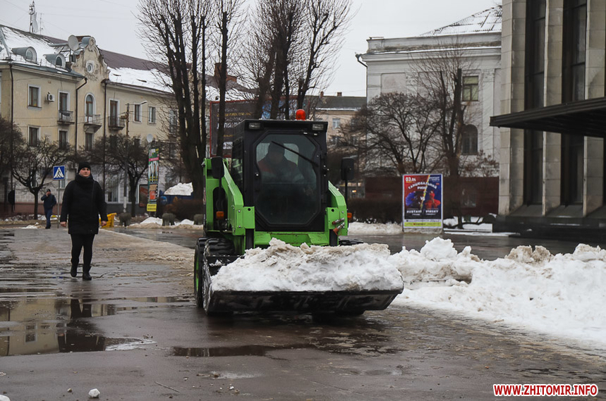Після кількаденних нічних морозів у 16-18 градусів з 13 на 14 січня в Житомирі розпочалася відлига. З самого ранку на центральних вулицях комунальники розчищають та вивозять сніг.