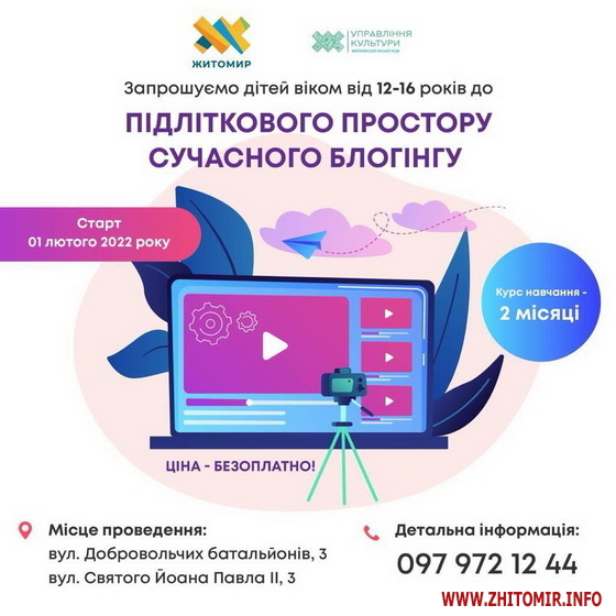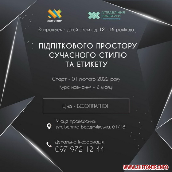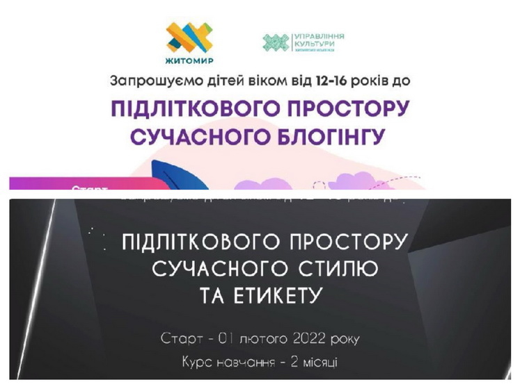 «Управління культури міської ради започаткувало серію навчальних курсів для підлітків, які стартують 1 лютого. Безоплатні заняття призначені для підлітків віком 12-16 років. Юним житомирянам розкажуть про розмовний та столовий етикет, а також як правильно користуватись такими платформами як: Instagram, TikTok,YouTube та Facebook», – йдеться у повідомленні.