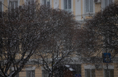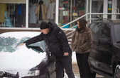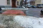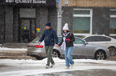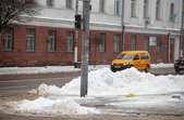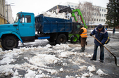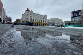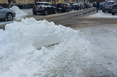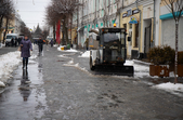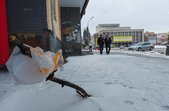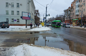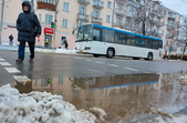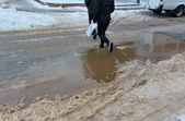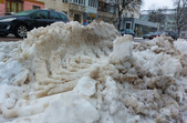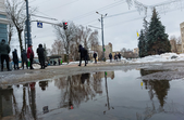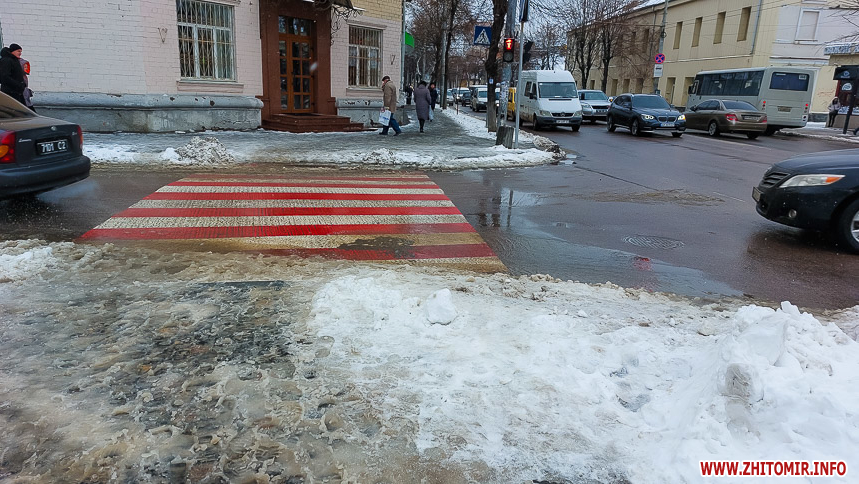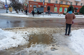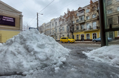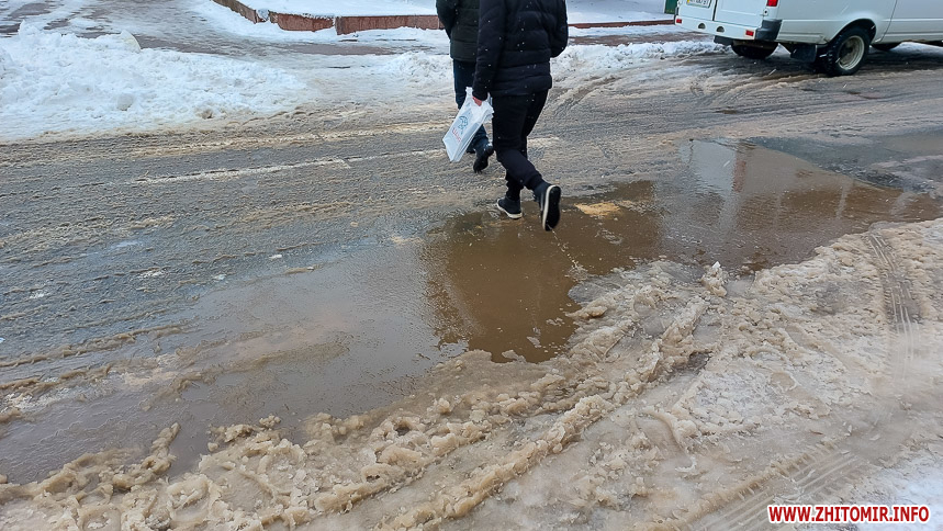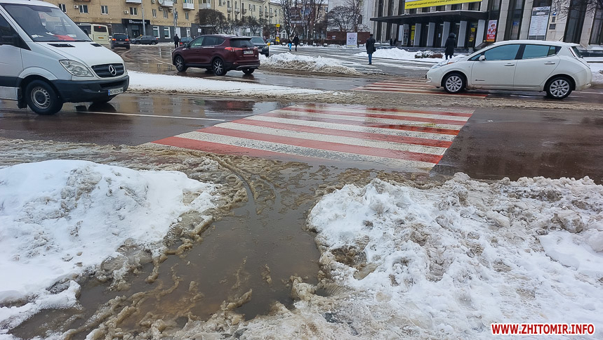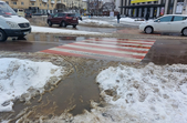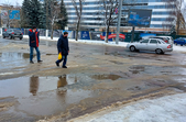 Комунальники весь день чистять місто, проте майже на усіх пішохідних переходах стоять величезні калюжі. На узбіччях доріг та на клумбах великі снігові кучугури.