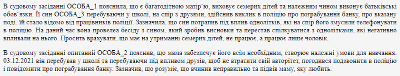 У судовому засіданні відповідачка зазначила, що є матір’ю семи дітей та запевнила, що належним чином виконує батьківські обов`язки. Проте її син, перебуваючи у школі, на спір із друзями здійснив виклик поліції та повідомив про пограбування банку. Про це їй, матері, стало відомо від працівників поліції.