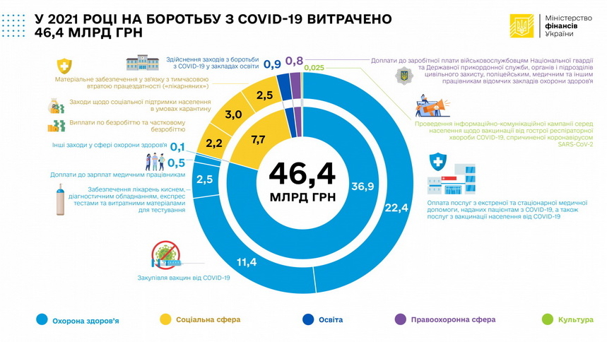 У 2021 році загальні видатки коштів держбюджету на протидію пандемії COVID-19 становили 46,4 млрд гривень.