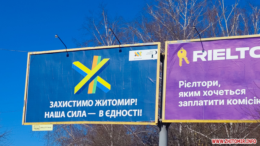 Та найбільше бордів у місті з написом "Захистимо Житомир! Наша сила в єдності!".