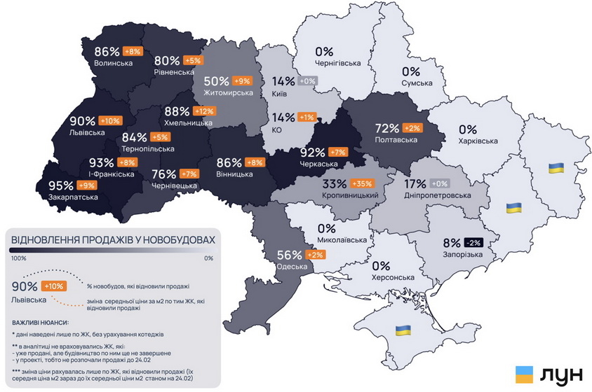 «Окремі регіони відновили продажі квартир у понад 90% нових житлових комплексів. Найбільший відсоток відкритих продажів у Закарпатській, Івано-Франківській, Черкаській областях, там їх відновили понад 92% ЖК. У Львівській області – 90%. Середня ціна у цих регіонах збільшилась на 7-10%. У дослідженні ціну квадратного метра у доларах станом на кінець квітня порівнювали з даними за 23 лютого», - пише видання.